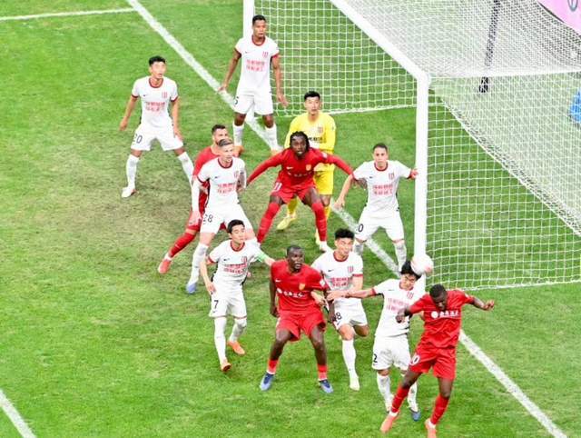下一个回合,重庆铜梁龙发动快攻,向余望的头球被刘殿座按住。