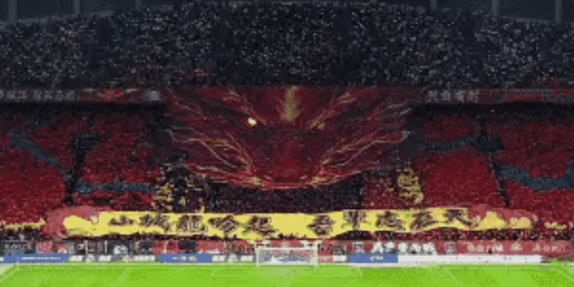 比赛开始时,重庆主场的气氛非常热烈!TIFO很有气势,一条巨龙徐徐展开。