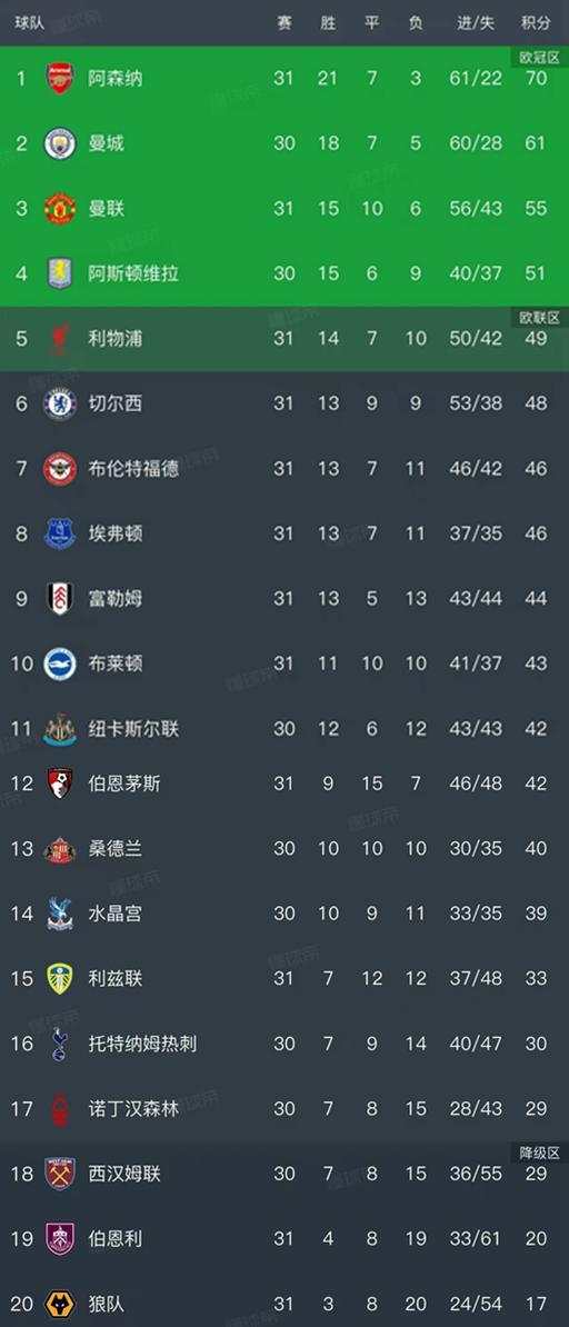 北京时间3月22日,英超第31轮在昨天到今天凌晨又结束了5场对决,我们看看最新积分榜变动,主要的信息是:利物浦1-2不敌布莱顿,切尔西0-3惨败埃弗顿,富勒姆3-1伯恩利,利兹联0-0布伦特福德,曼联2-2伯恩茅斯!