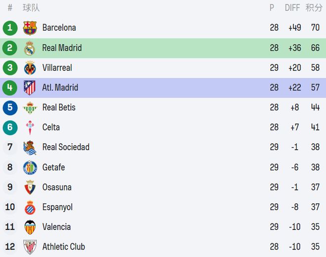 皇马目前积66分排名西甲第2,落后榜首巴萨4分。在联赛还剩10轮的情况下,银河战舰必须全力抢分,为5月11日与巴萨的直接对话积蓄资本。马竞积57分排名第4,落后第4名比利亚雷亚尔1分,领先贝蒂斯的13分,欧冠席位相对稳固,但与争冠集团已拉开较大差距。