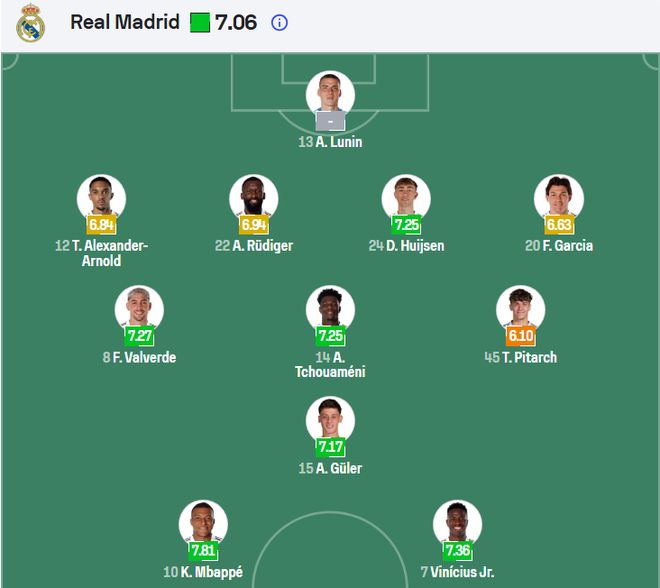 后防线上,库尔图瓦因伤缺阵至少一个月,卢宁将首发出战,这将是乌克兰门将第四次出战马德里德比。吕迪格和怀森的中卫组合已连续三场首发,特伦特镇守右路,伤愈归来的卡雷拉斯出任左后卫。中场方面,巴尔韦德、楚阿梅尼、皮塔奇、居莱尔预计首发,贝林厄姆可能替补待命。