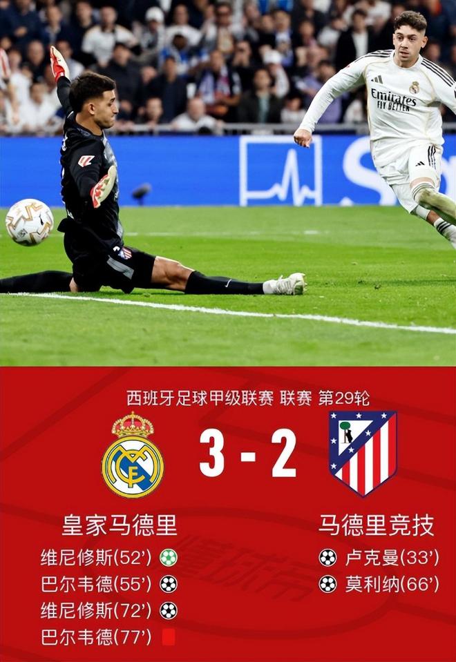 北京时间3月23日4:00,西甲第29轮上演马德里德比,皇家马德里坐镇伯纳乌球场迎战马德里竞技,主裁判何塞-穆努埃拉执法本场比赛。上半场,朱利亚诺-西蒙尼脚后跟助攻卢克曼首开纪录。下半场风云突变,维尼修斯点射扳平,巴尔韦德外脚背破门反超,莫利纳世界波再度扳平,随后维尼修斯内切兜射梅开二度,巴尔韦德终场前被直红罚下。最终,皇马3比2逆转马竞,拿下德比胜利。