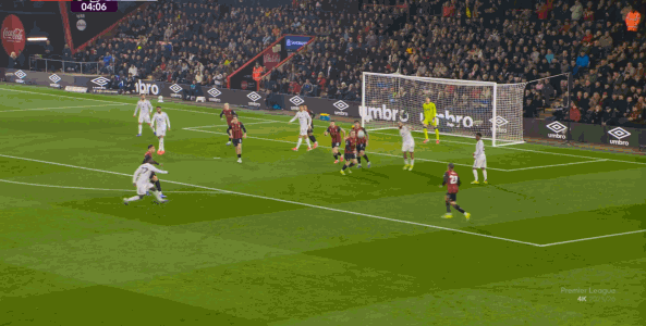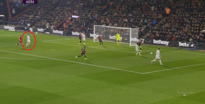 那么在这场比赛,曼联的弱点是如何暴露出来的?其实就发生在第27分钟这次高位逼抢,伯恩茅斯分到边路之后,库尼亚稍微松懈一点点,他们就成功抢到了卡塞米罗的身前,从而制造了他的黄牌: