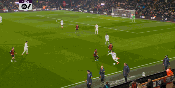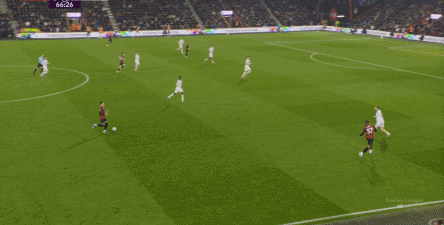 这个时候,曼联想要打出优势,就需要找其中还能勉力维持的点位,这个点位就是库尼亚,一方面他的确是比较全面,所以身体撑得住技术的基本发挥,另一方面就是他对位的伯恩茅斯右后卫阿莱士-希门尼斯比较弱,所以在这个一对一里,曼联可以打出优势,从而形成局势上的平衡,甚至是反超: