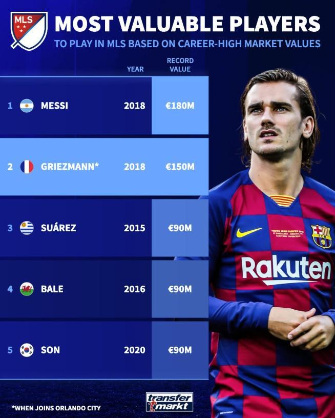 北京时间3月24日,奥兰多城官方宣布,马竞前锋格列兹曼将于下赛季加盟球队,德转也列出了效力过或即将效力美职联的球员巅峰身价榜,梅西的1.8亿欧元居首,格列兹曼1.5亿欧排名第二。