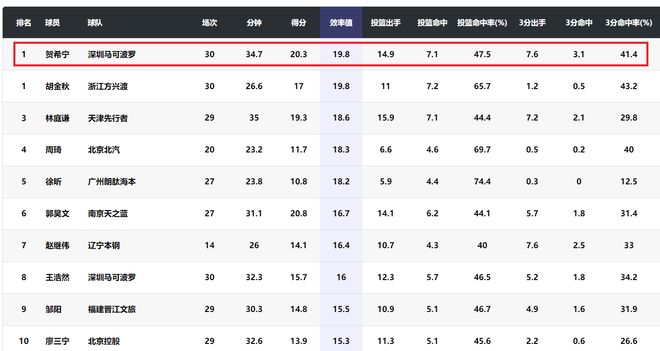 此外,贺希宁的效率值19.8和胡金秋并列联盟第一。贺希宁俨然成为本赛季常规赛MVP的候选人之一。贺希宁本赛季多项数据创造了生涯新高,他的进步肉眼可见。