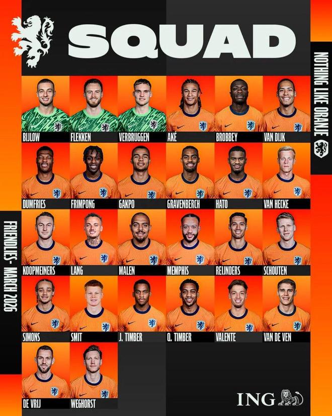 利物浦的范迪克、热刺的范德芬、曼城的内森·阿克、国米的德弗里、布莱顿的范赫克、阿森纳的廷贝尔和切尔西的约雷尔·哈托,上述7人是本次国际比赛日「橙衣军团」征召的能踢中卫的国脚。