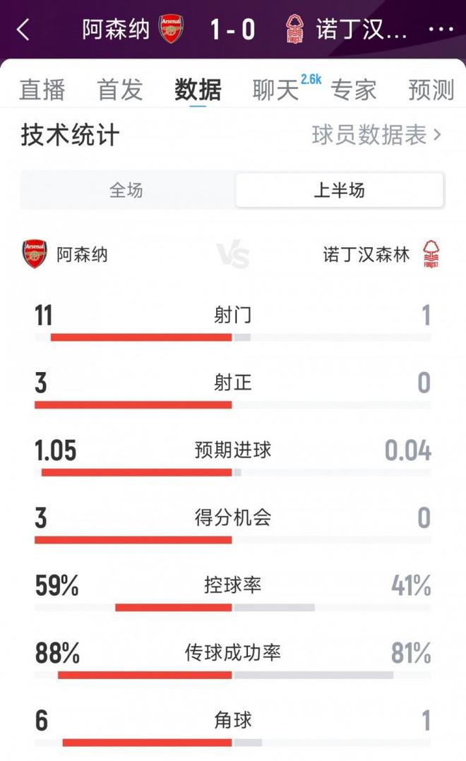 直播吧9月13日讯 在本轮英超阿森纳对阵诺丁汉森林半场结束,枪手凭借苏维门迪的远射暂时1-0领先。以下为双方半场数据对比: