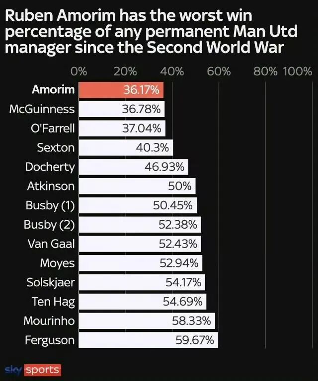 据数据统计,输掉本场比赛后,阿莫林成为了二战以来胜率最低的曼联主帅(临时主帅不包括在内),胜率仅有36.17%。媒体还称如果曼联继续这么打,阿莫林可能坚持不到圣诞节。