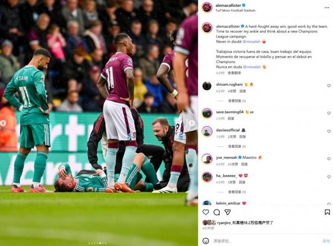 本场比赛麦卡利斯特上半场遭对手乌戈丘库飞铲脚踝受伤,下半场被替换下场。麦卡利斯特在社媒写道:“一场艰难的客场胜利,全队都做的不错。现在需要尽快恢复脚踝伤势,并考虑周中的欧冠比赛。永远不要怀疑萨拉赫!”