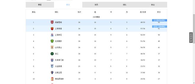 截至25赛季中超第24轮赛程,排在积分榜前四的球队分别是积53分的成都蓉城、积51分的上海海港、积50分的上海申花、积48分的北京国安。