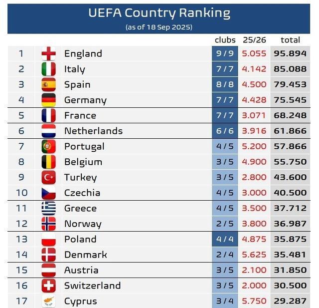 直播吧9月19日讯 欧冠联赛阶段首轮已经完赛,相关机构也统计了本赛季的欧战积分情况,并更新了欧足联旗下各协会的积分排名。英格兰依然独自领跑,而意大利第二的位置仍暂时牢固,但领先优势有略微缩小。
