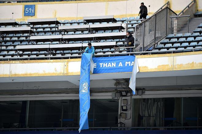 2021年4月,南京奥体中心逐步去除苏宁的横幅。视觉中国 图