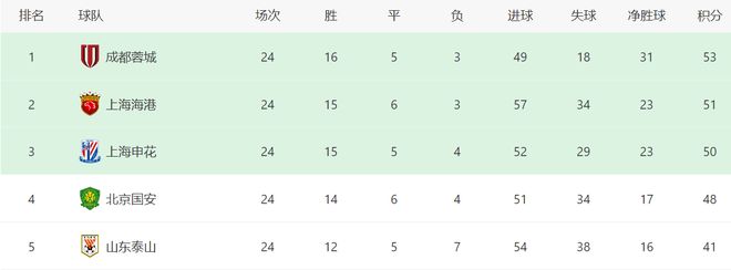 目前中超积分榜,成都蓉城积53分、上海海港积51分、上海申花积50分、北京国安积48分,分列前四位,由于联赛仅剩六轮情况下,每一场比赛都是非常关键,尤其争冠球队直接较量,更是重中之重。