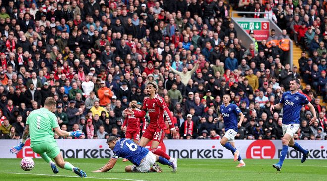 随着主裁判一声哨响,利物浦就在安菲尔德漫天的加油声中,朝着埃弗顿的球门发起了猛攻,第10分钟萨拉赫右路挑传禁区,赫拉芬贝赫顺势撩射,打入一记精彩的神仙球,帮助利物浦取得了1-0的梦幻开局,23岁的赫拉芬贝赫成为了在默西塞德德比进球最年轻的荷兰球员,而萨拉赫也凭借这一次助攻,将自己英超助攻数提升到了89次,排名历史第九。