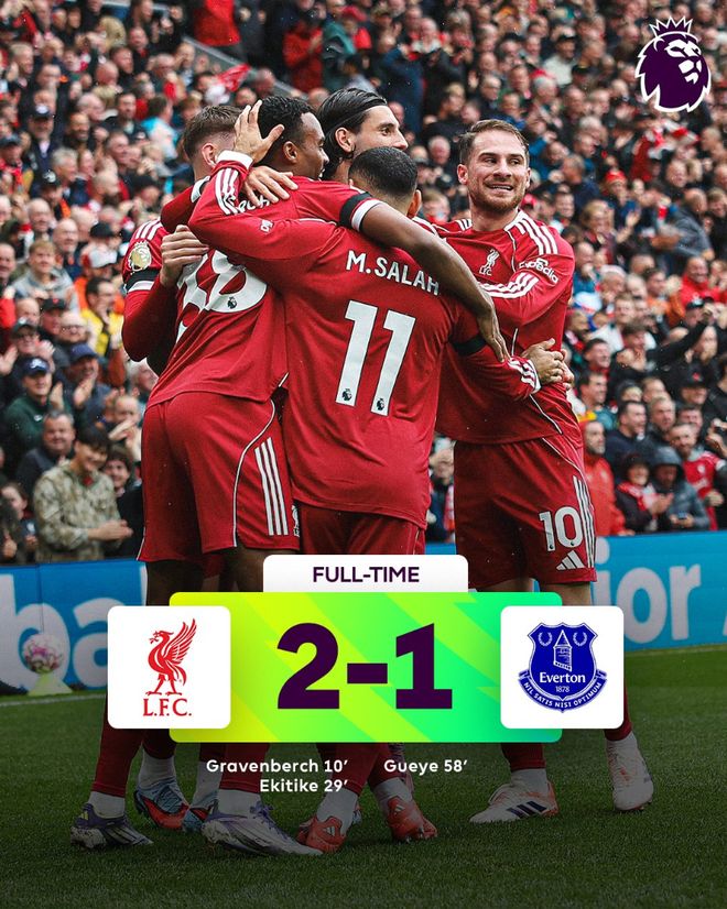 雷速体育9月20日讯 在今晚刚刚结束的默西赛德郡德比战中,利物浦2-1战胜埃弗顿。荷兰中场赫拉芬贝赫和法国前锋埃基蒂克为红军分别建功。