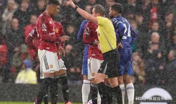 随后比赛进入了卡塞米罗时间,第37分钟,曼联角球进攻,卢克肖头球摆渡,卡塞米罗后点头球破门,扩大比分!但是半场补时阶段,卡塞米罗在防守中犯规,吃到了第2张黄牌,被红牌罚下,阿莫林气得在场边摔掉了水瓶!英超近十年首次出现上半场两队都吃到红牌的情况。