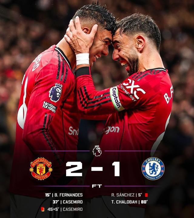 随着主裁判吹响哨声,曼联主场2-1击败切尔西,赢得了这场英超红蓝大战的胜利!