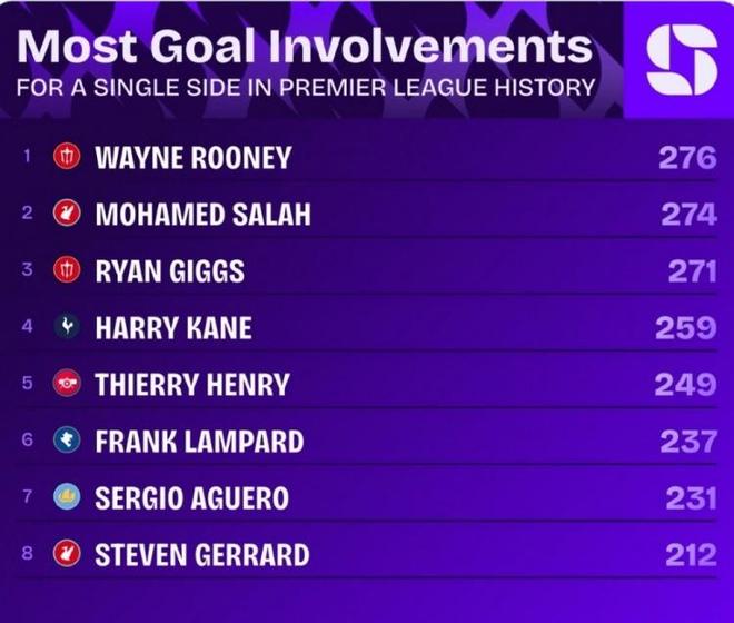 与此同时,英超历史数据也在不断被刷新,正如英超单一球队参与进球榜所呈现的:鲁尼(曼联 276 球)的纪录仍在等待挑战者,萨拉赫(274 球)仅差 2 球便能追平传奇,吉格斯、凯恩、亨利等名字则早已将自己的印记刻在联赛历史中。