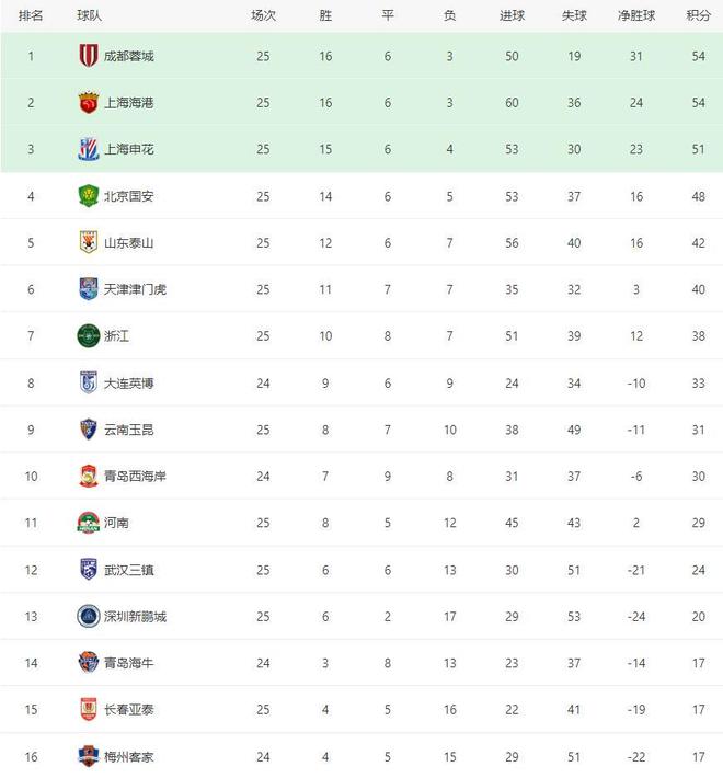 成都蓉城积54分、上海海港积54分,因净胜球不同分列前二名,另外上海申花积51分继续排名第三,北京国安积48分仍排第四,基本退出争冠。
