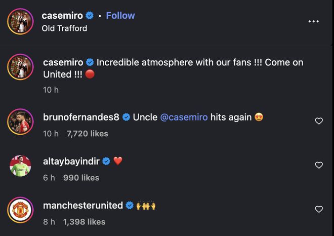 B费在评论区现身并对卡塞米罗的帖子作出回应,巴因迪尔也通过在曼联球星的动态下留下一个爱心表情以示支持。