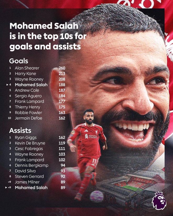 目前,萨拉赫同时跻身英超历史进球和助攻榜前十。