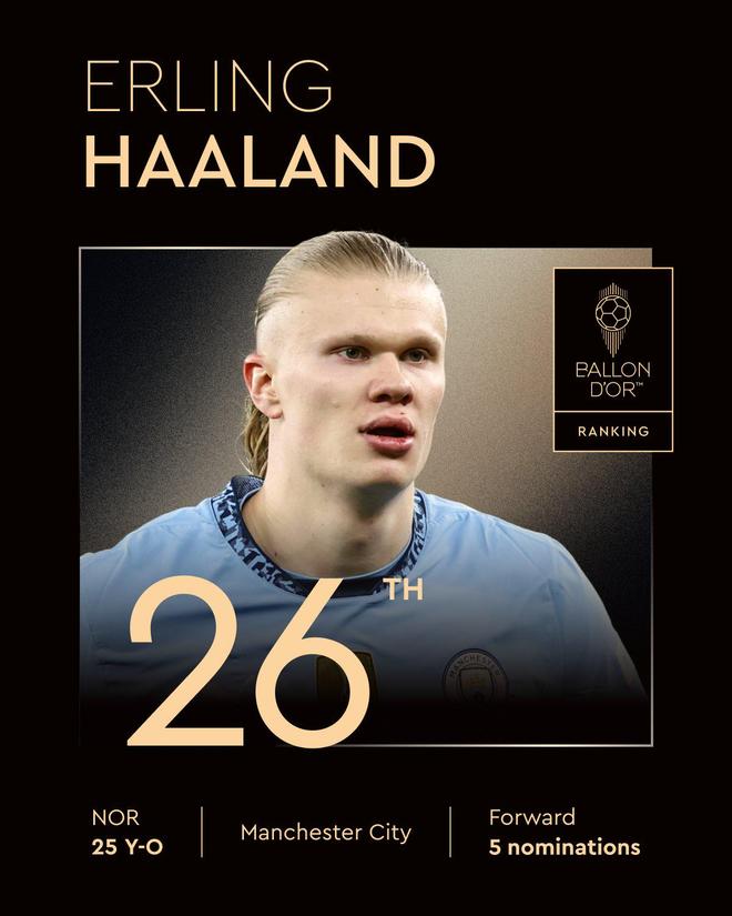 最终,哈兰德仅获第26名,相较于去年下降21名。