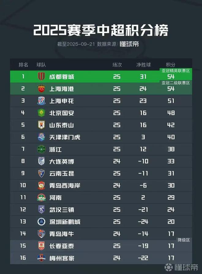 从目前积分榜来看,成都蓉城与上海海港同样积54分,并列积分榜前两位,上海申花积51分落后榜首3分,仍有冲击冠军的希望,北京国安积48分排名第四,6分差距争夺冠军的希望渺茫。
