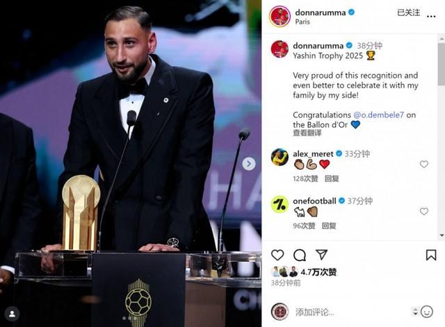 多纳鲁马社媒晒出领奖的照片,并写道:2025年雅辛奖非常自豪能获得这份认可,能与家人一起庆祝感觉更棒了!”