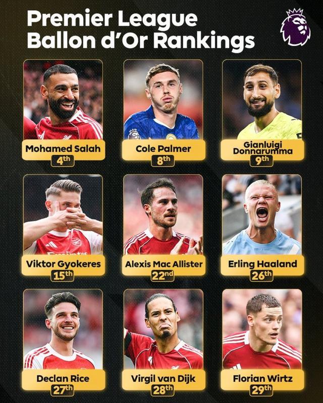 直播吧9月23日讯 2025年金球奖排名已经确定,前30中共9名目前在英超效力的球员,英超官方晒出这些球员以及具体排名,萨拉赫第4为英超球员最高。