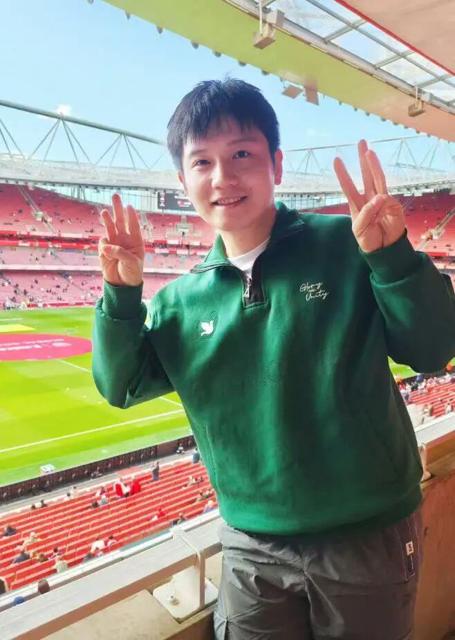 9月22日,樊振东发文“第一次现场看英超”,配图手指比三。