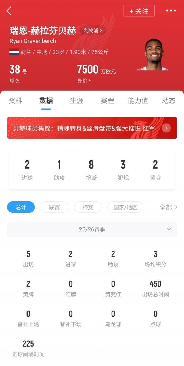 23岁的赫拉芬贝赫2023年以4000万欧转会费从拜仁加盟,根据capology的数据,球员目前在利物浦的周薪为15万镑,合同还剩3年到期。