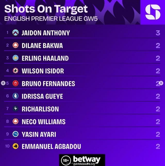 直播吧9月24日讯 英超第5轮战罢,squawkafootball列各项数据排行,伯恩利前锋杰顿-安东尼是射正次数最多的球员,共3次。