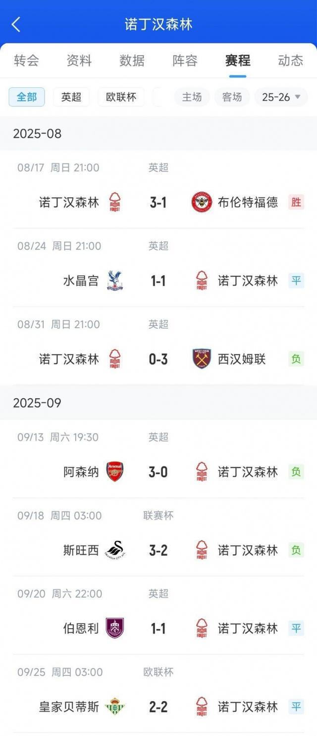 直播吧09月25日讯 欧联杯首轮,诺丁汉森林2-2遭贝蒂斯绝平,近1个月1胜难求。