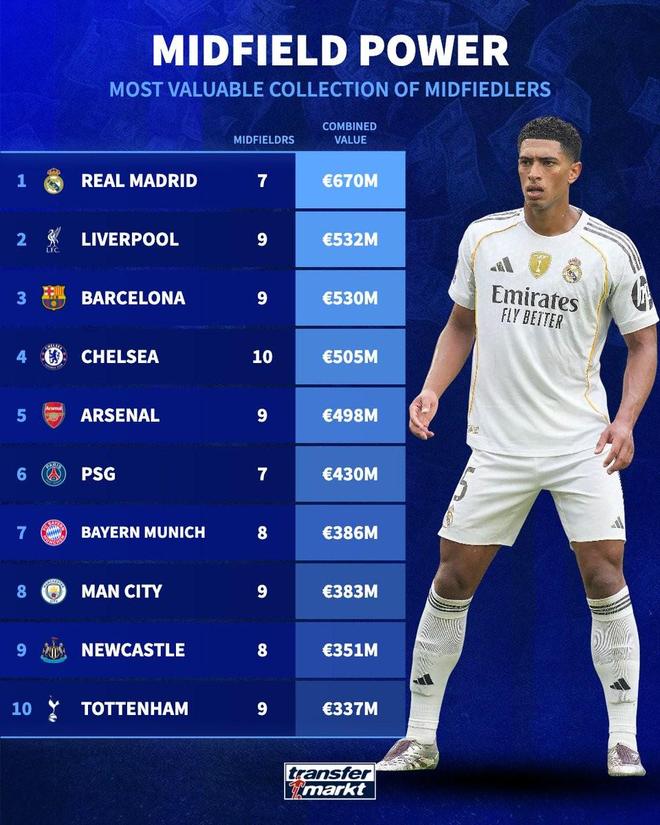 德国转会市场网站列出了球队中场球员总身价排行榜,皇家马德里以6.7亿欧居首,利物浦以5.32亿欧排名第二,巴塞罗那以5.3亿欧位列第三。
