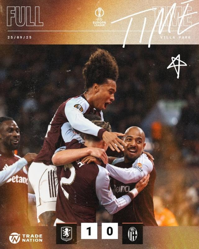 直播吧9月26日讯 欧联杯联赛阶段第一轮,维拉主场1-0战胜博洛尼亚收获赛季首胜,赛后维拉官方发布海报庆祝。