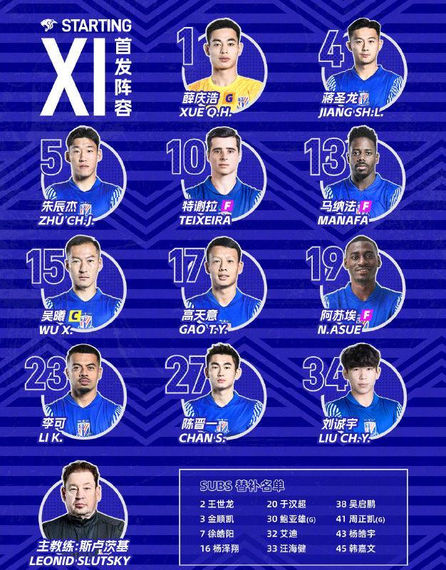 上海申花首发:1-薛庆浩、4-蒋圣龙、5-朱辰杰、13-马纳法(F)、27-陈晋一、23-李可、10-特谢拉(F)、15-吴曦、17-高天意、19-阿苏埃(F)、34-刘诚宇