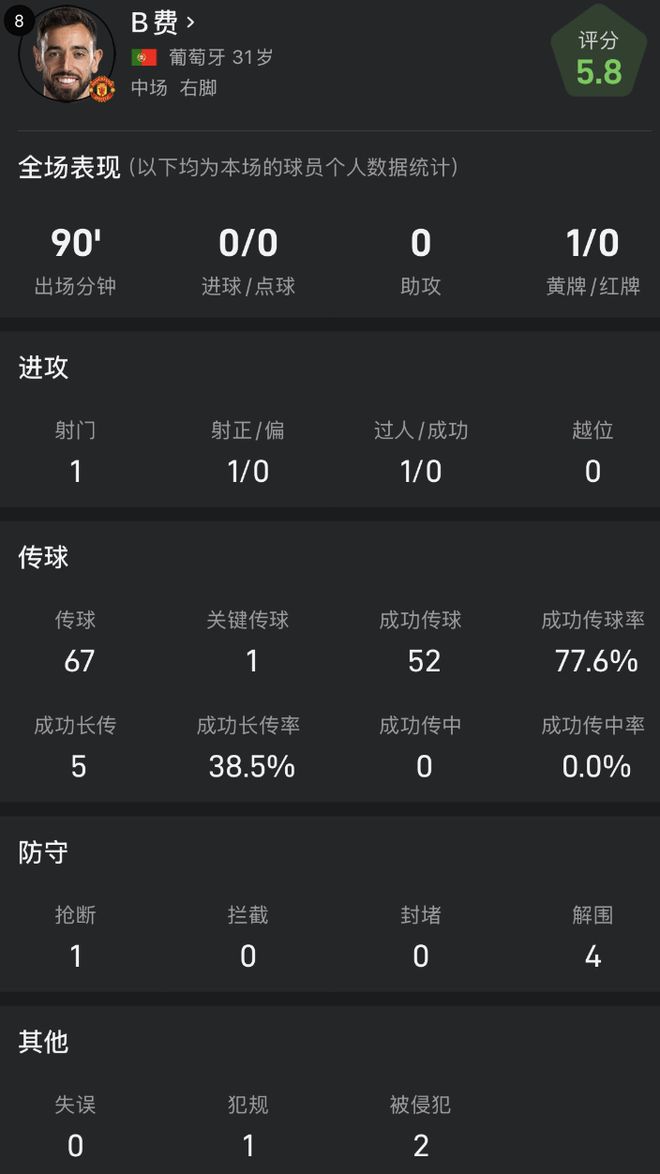 雷速体育9月27日讯 英超第6轮比赛,曼联客场1-3不敌布伦特福德。本场比赛,B费表现低迷,他在第75分钟罚丢了姆伯莫创造的点球,这也是他本赛季第二次罚丢点球。