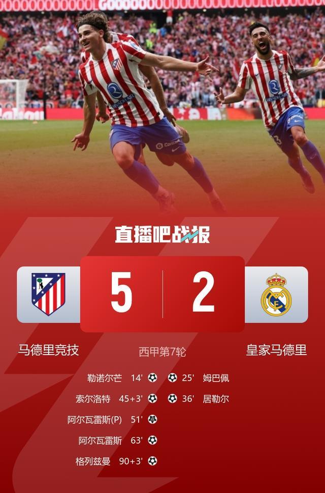 西甲第7轮,马竞5-2大胜皇马,阿尔瓦雷斯梅开二度。