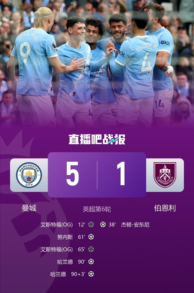 英超第6轮,曼城5-1大胜伯恩利,哈兰德梅开二度,艾斯特福2次自摆乌龙。