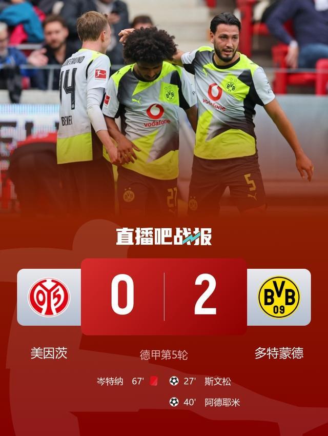 德甲4连胜!多特2-0十人美因茨 阿德耶米破门+造红牌布兰特两助攻