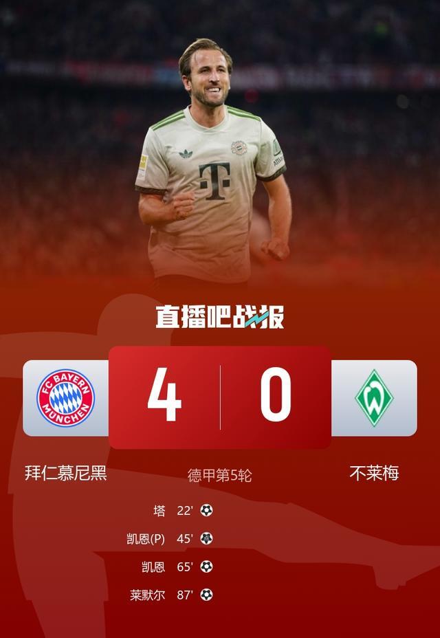 德甲第5轮,拜仁4-0大胜不莱梅,凯恩梅开二度。
