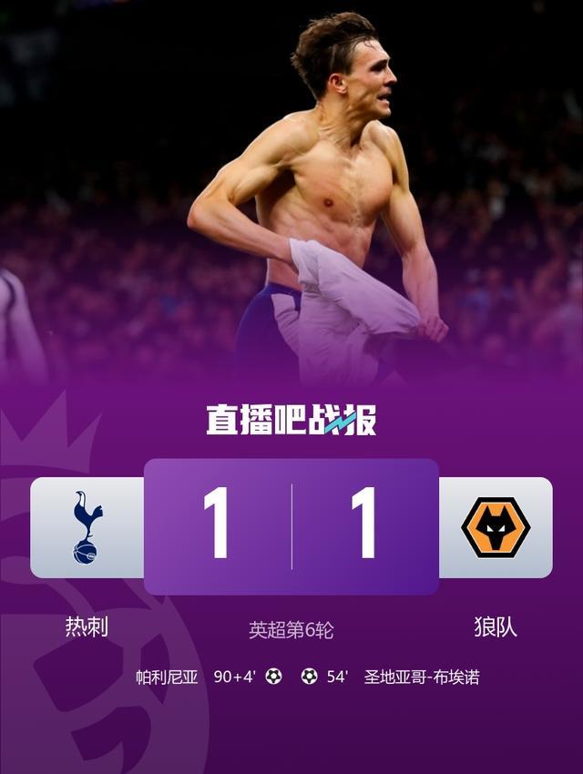 近4轮仅1胜!热刺1-1对狼队连续六场不胜 帕利尼亚补时绝平
