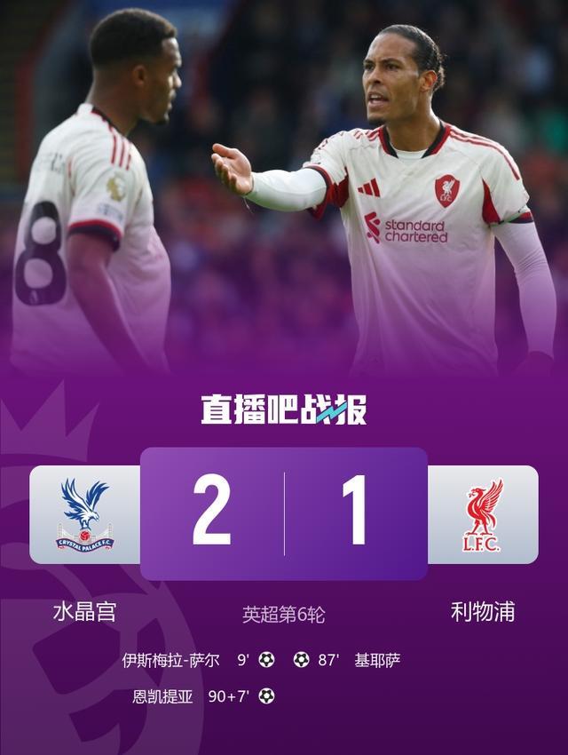 英超第6轮,水晶宫2-1绝杀利物浦,恩凯提亚补时制胜。