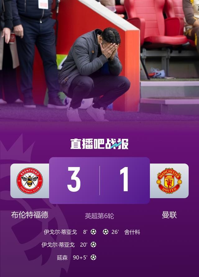 英超第6轮,曼联客场1-3布伦特福德,舍什科处子球。