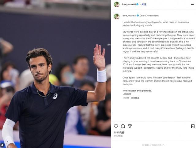 9月27日讯 意大利选手穆塞蒂在INS发文,为昨日中网比赛骂场边咳嗽球迷的无理行为致歉。
