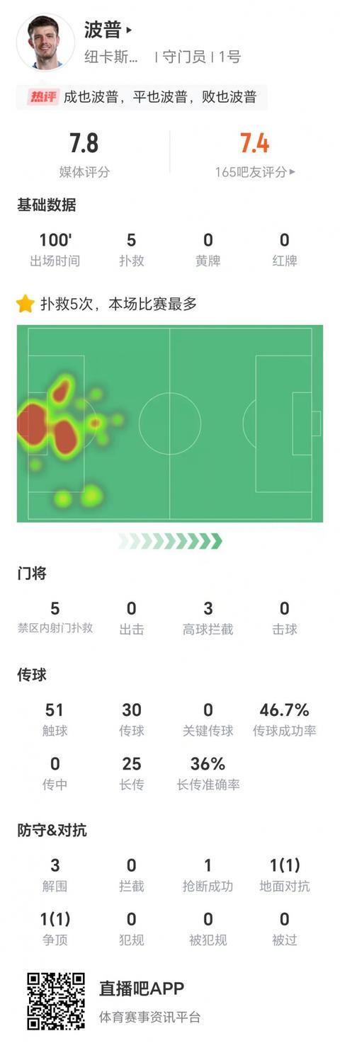 赛后技术统计数据显示,波普本场比赛有着5次扑救,3次高球拦截,3次解围,1次抢断,获评7.8分。