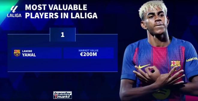 1 巴萨-亚马尔(18岁) 2亿欧(较上期保持不变)