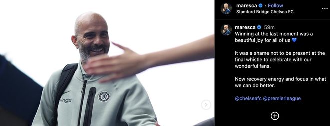 雷速体育10月6日讯 英超第7轮,切尔西在主场凭借埃斯特旺的绝杀以2-1的比分战胜利物浦。赛后,本场比赛吃到一张红牌的马雷斯卡在社媒上发表了自己的感受。