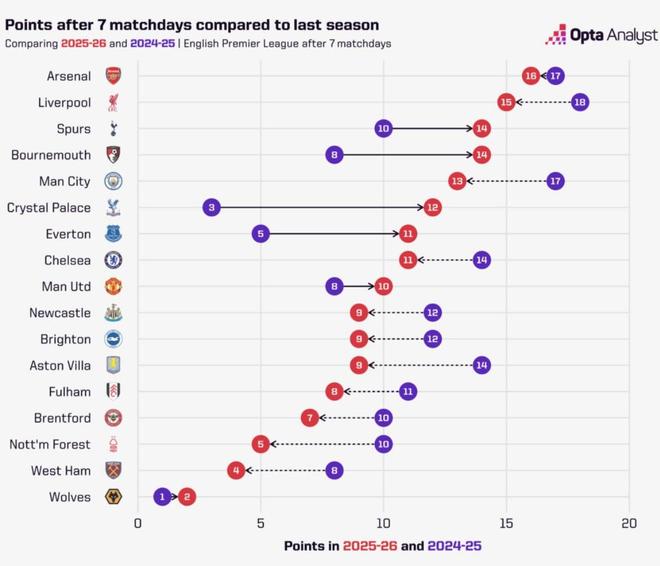 Opta列出了本赛季英超球队与上赛季前7轮过后的积分对比,阿森纳少拿了1分,利物浦少拿了3分,水晶宫多拿了9分进步最大,曼联则多拿了2分。